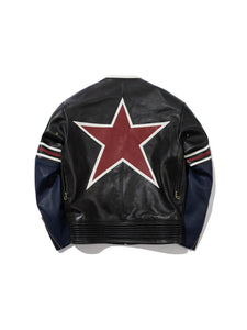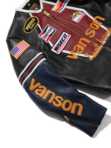 Introducing the Original Star Racing Jacket - Black/Red. Expertly crafted from competition weight steerhide, this iconic Vanson jacket features beaded leather collar, assorted racing patches, and embossed Vanson Oval. With windtight low-bulk zip close sleeves, underarm ventilation grommets, and a leather windflap with license pocket, this jacket offers superior performance and style for avid bikers.