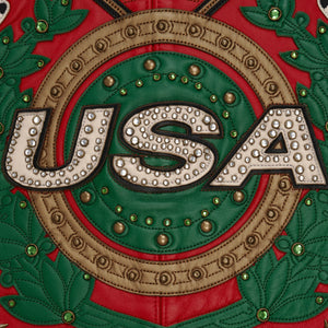 2 color pieced plush leather front of the jacket with oversized leather applied pelle pelle with rhinestones and 78