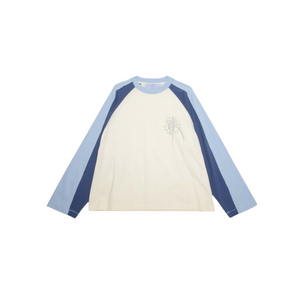 220 gsm 100% cotton. Boxy Fit Long Sleeve Tee with paneled raglan sleeves and raw edge seams. Loose thread embroidery detail